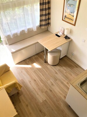 The apartment was reasonably clean. However, the sleeping quarter is rather cramp. It is above the bathroom with a tiny ladder to go up and down. It is only 4ft high, so one has to bend down all the time.
