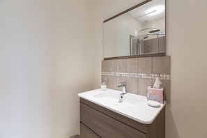 Nous avons bénéficié de la seule chambre qui soit attenante à la maison. Une porte fenêtre pour l'entrée, seul point de lumière de la pièce, refaite à neuf. Une déco sobre, un placard, un fauteuil, un lit. Deux portes en face, donnant sur les toilettes et la douche. Comme il n'y a pas de fenêtre dans la douche, les serviettes ont du mal à sécher pendant la nuit !