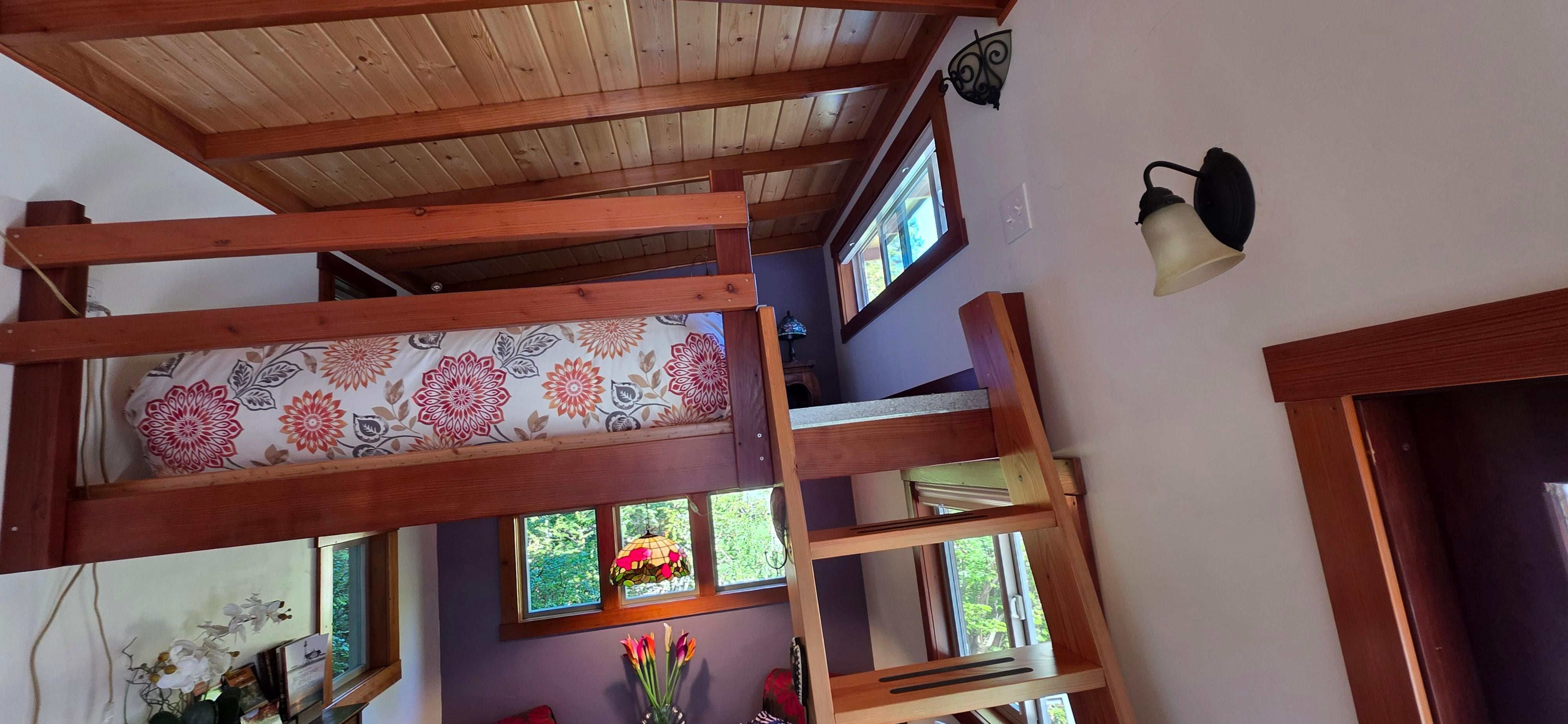 Beautifully made tiny house, tastefully decorated.and in a quiet and serend location. It did not have a microwave or way to heat food which I missed in the description. We were happy we did not need to go to the bathhouse during the night as it was a distance from the house and no shoes allowed in the house. and going down the ladder to get to the bottom floor.Bed was super comfortable and everything one needed was provided for our stay. We thought it was a bit pricey however.
