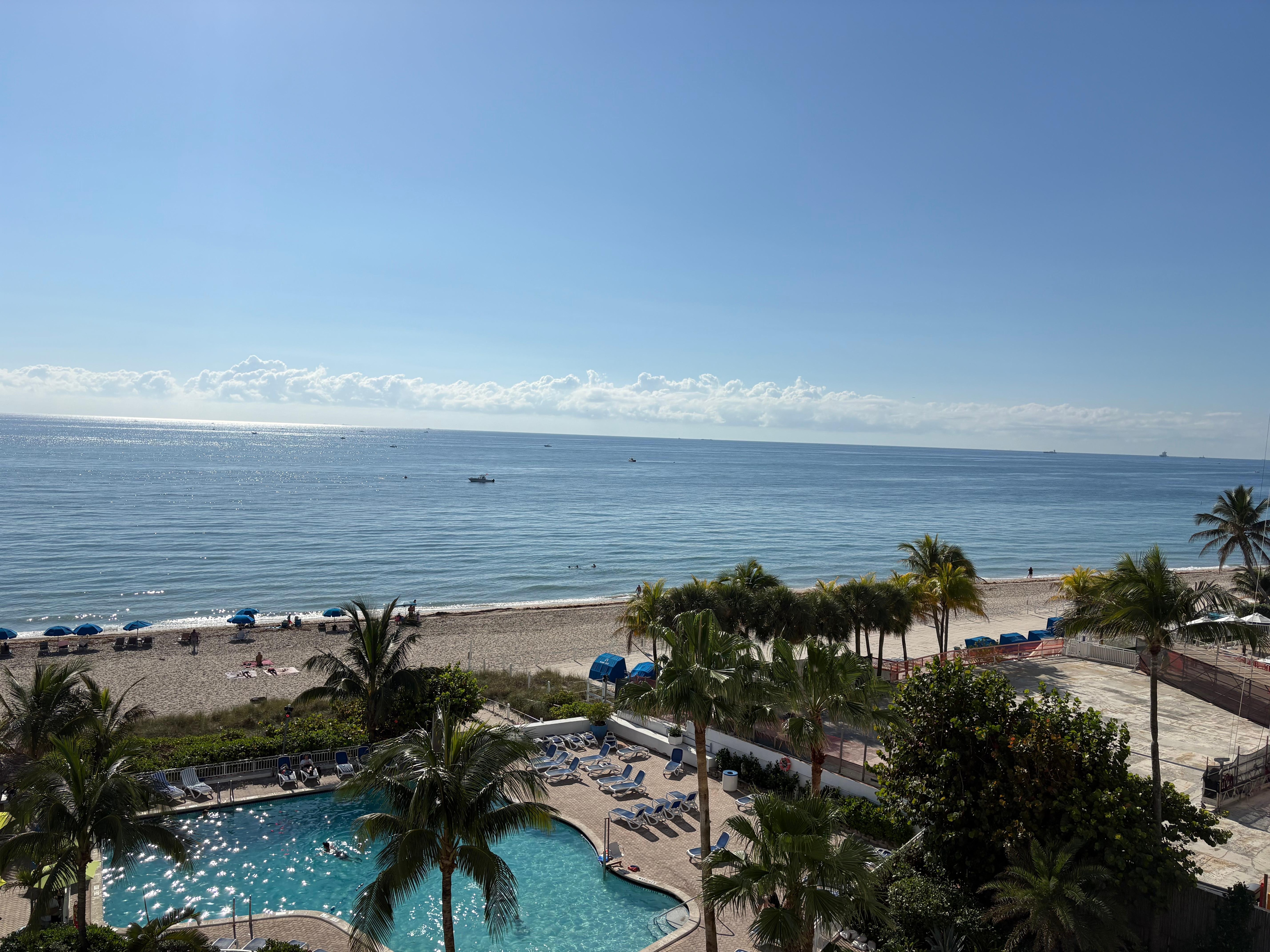 Ocean view/beachfront with balcony on its own private beach (Fort Lauderdale). Very well furnished, 1 king bed, 1 twin folding bed, table with 2 chairs, full kitchen (microwave, refrigerator, stove and oven, dishwasher, coffee maker, toaster, cookware, dinnerware set), hair dryer, iron and ironing board, safety box and complementary amenities, including towels, shampoo and conditioner, soap, coffee are provided. The place has a large heated pool, tiki sports bar/restaurant, pool cabanas available, new five star italian restaurant "Casa Calabria", SPA, fitness center ($20 day pass), gift ship, jewelry, and much more. The unit has a fantastic ocean view balcony with a table and 2 chairs where can enjoy a beautiful sunrise or rest from a busy and sunny beach day. Walking distance to many shopping plazas, Mc Donalds, Dunkin Donuts, Winn Dixie, Bank of america and more restaurants and entertainment. Valet parking $18 per day unlimited in and out, umbrellas and lounges chairs available for rent from hotel ($15 each), no charge for pool lounges. Coffee shop in lobby . Also you can enjoy the local activities, such as local free trolley, jets skis, paddleboards, kayaks, bike rentals, dive shops, water taxi, sports bars, nightlife entertainment, fishing pier, deep-see fishing and parasailing, just to mention some.
