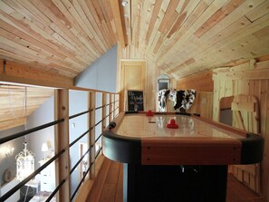 Im Inneren erwartet Sie ein elegantes Wohnzimmer mit Kamin und Flügeltüren zum Garten. Die voll ausgestattete Küche, der große Essbereich und das Kinderspielzimmer sorgen für Komfort und Familienfreundlichkeit. Verbringen Sie gemütliche Abende mit Tischfußball, Airhockey oder in der Lounge.