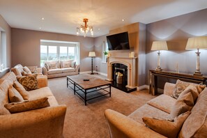 Le salon a 4 grands canapés, télévision à écran plat, vue sur la riviÚre