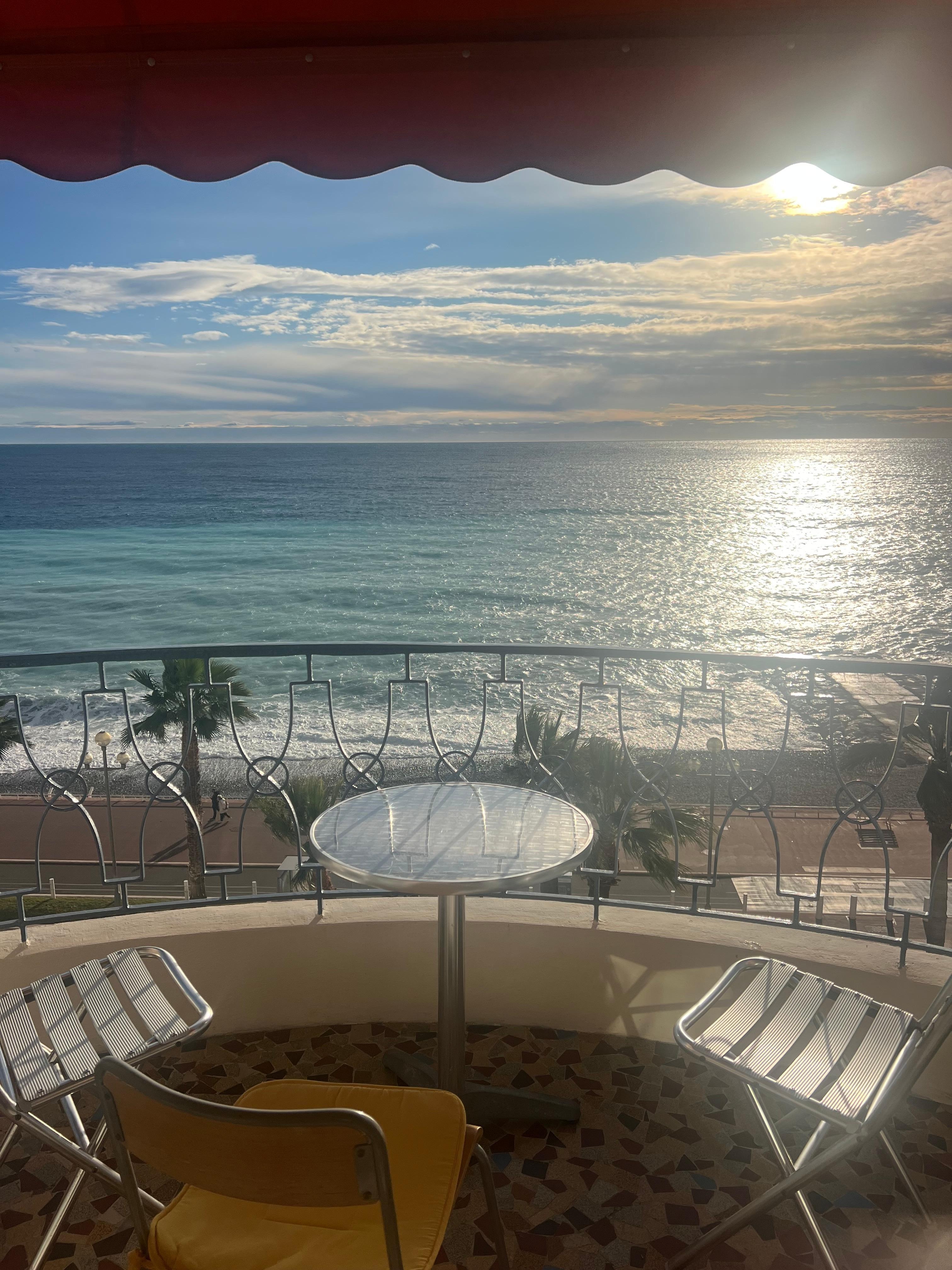 GenieĂen Sie Ihre morgendliche Tasse Kaffee auf dem Balkon dieser Ferienwohnung in Nizza mit Blick auf das Mittelmeer und den Sonnenaufgang. Alle unsere GĂ€ste sagen uns, dass ihnen die Aussicht jedes Mal den Atem raubt, wenn sie sie sehen. GenieĂen Sie morgens Ihren Kaffee und abends Ihr Glas Wein.