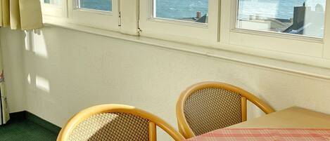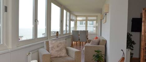 In der Villa Seeblick stehen Ihnen ein Fahrstuhl und ein Treppenhaus für die oberen Stockwerke zur Verfügung. Das vollausgestattete Ferienappartement befindet sich in der obersten Etage der Villa Seeblick mit traumhaftem Blick auf die Ostsee und über die Altstadt. Die im Juli 2017 komplett renovierte Wohnung verfügt neben einem Duschbad über ein großzügiges und helles Schlafzimmer mit Doppelbett und Flachbild-TV sowie über einen gemütlichen Wohnbereich mit einer großen nach Süden ausgerichteten Fensterfront, die den wundervollen, weiten Blick auf die Ostsee freigibt. An den charmant eingerichteten Wohnraum angeschlossen finden Sie den separaten aber offenen Küchenbereich mit moderner Einbauküche. Diese ist mit einem Kühlschrank mit Gefriermöglichkeit, einer Mikrowelle, einer Geschirrspülmaschine, einem Herd mit Backofen, Kaffeemaschine, Toaster, Wasserkocher und vielen weiteren Küchenutensilien ausgestattet. Der Essbereich befindet sich vor der großen Fensterfront im Wohnzimmer. Genießen Sie hier zum Beispiel den Sonnenaufgang bei einem gemütlichen Frühstück. Im Wohnbereich gibt es eine ausziehbare Schlafcouch für zwei Personen, Radio und einen großen Flachbildfernseher. Weitere Annehmlichkeiten des gemütlichen Appartements sind außerdem noch ein Bügelbrett und ein Bügeleisen. Der Pkw-Stellplatz zur Wohnung befindet sich im Parkhaus am Stadthafen, ca. 500 m entfernt. Eine Fahrradunterstellmöglichkeit steht nicht zur Verfügung.