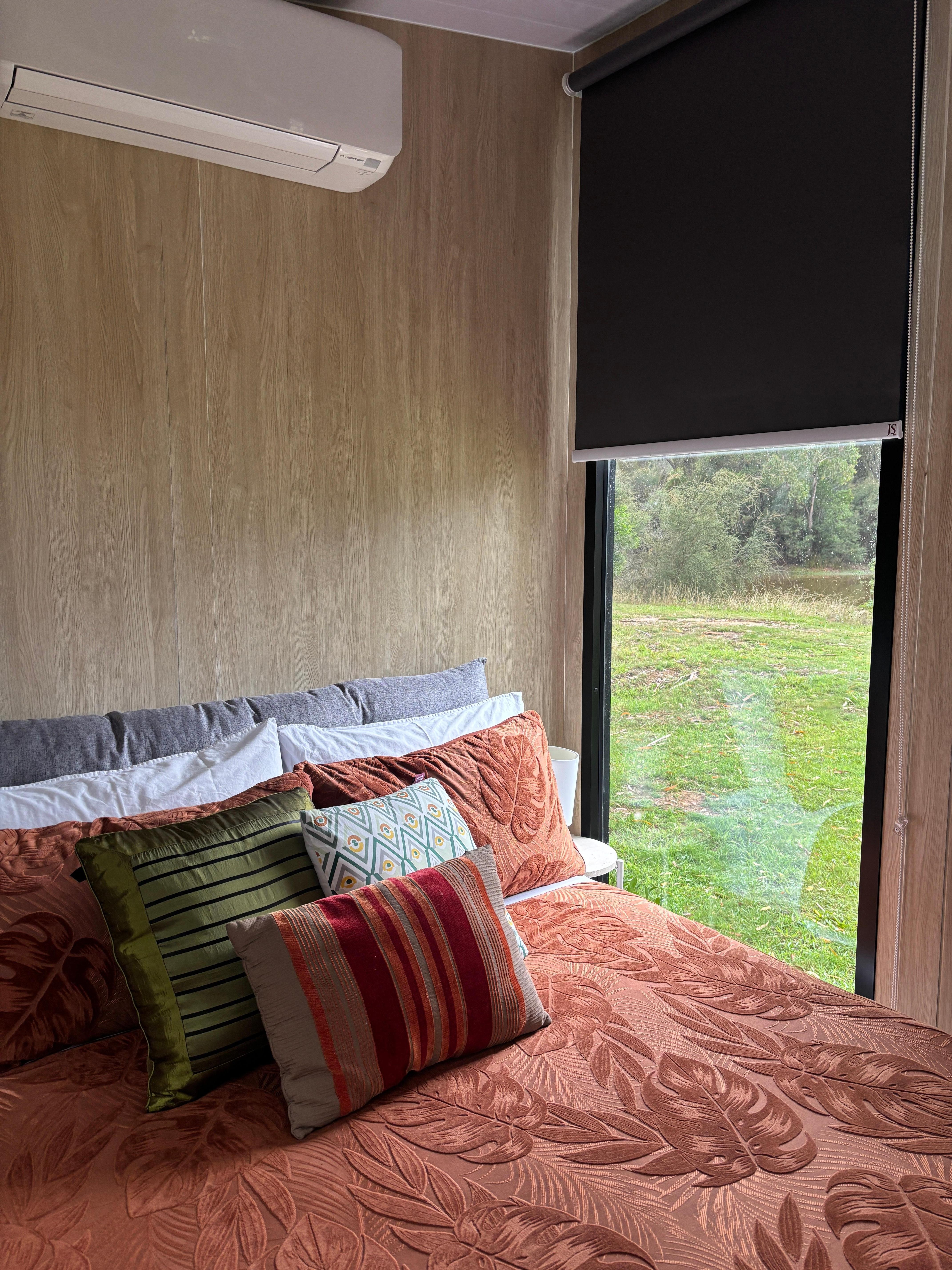 A cozy 139-square-foot tiny house with easy access to water, split air conditioning, a kitchenette, cooking equipment, and excellent bathroom facilities. These amenities include an eco-friendly cassette toilet with a removable waste holding tank, hand basin, and gas-heated shower.