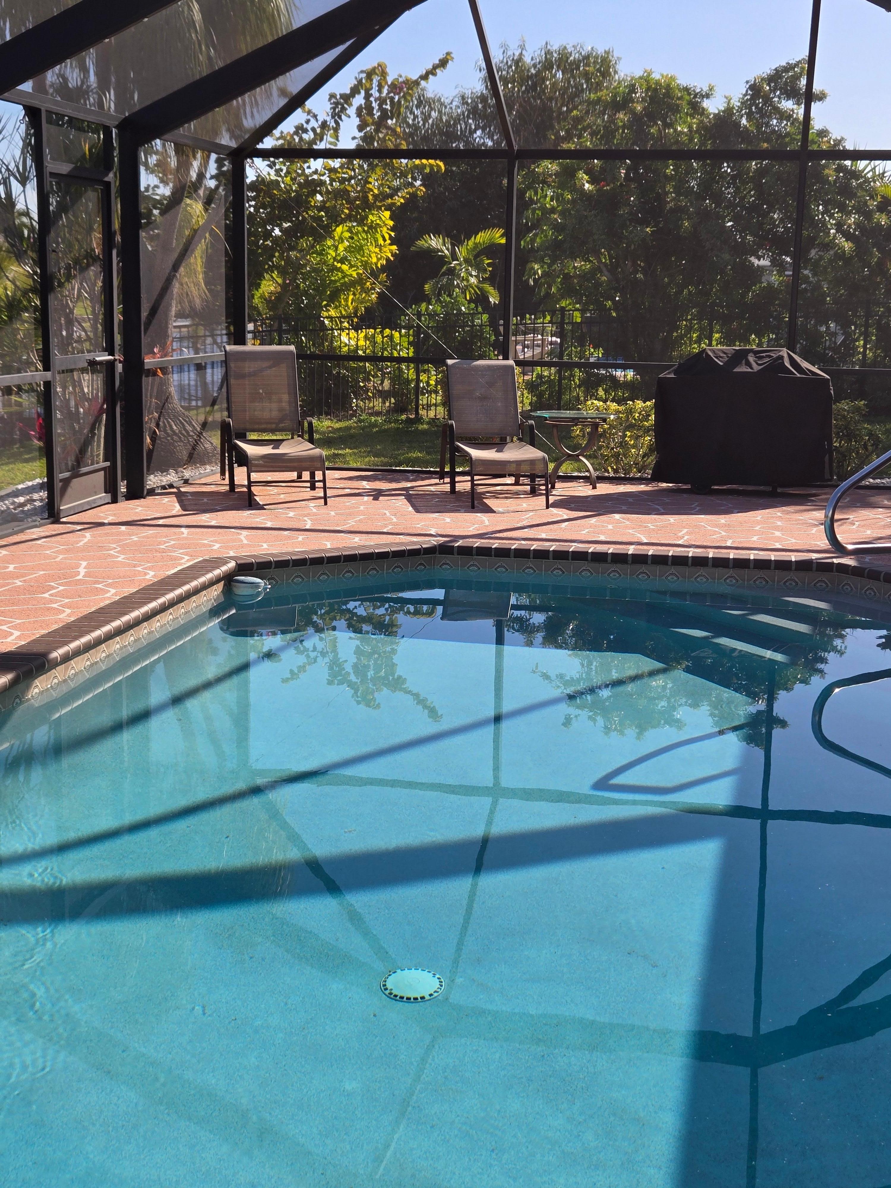 If you’re in the mood for rejuvenating waterfront getaway this is house for you. This beautiful 3 bedrooms 2 bath with accommodation for 6 and private swimming pool and dock, You’re sure to experience the best of outdoor living here! Get used to spending your vacation days lounging by the alluring screened swimming pool or fishing on the private dock. Even on the balmiest of days, refreshing breezes from the fresh water canal keep you cool as you relax on the specious lanai, complete with patio furniture. You will love how the exteriors flows with the bright and airy interior. Sliders from the dinning room , as well as sliders from master bedroom kitchen and door from guest bathroom open onto the lanai, allowing you to easily access the outdoor space. After a day of exploring beaches adventures, whip up tapas and cocktails in the fully equipped brand new kitchen just remodeled May 2020, complete with all the necessary appliances and kitchen tools. For a relaxing evening indoors, lounge on living room couch, while you watch movies on the brand New 55inch flat screen smart TV and 32 inch TV with local Channels and DVD player in the master bedroom or surf the web via wireless internet for entertainment. All the other amenities you need in your ultimate home - away -from -home are here, including air conditioning and in - unit washer and dryer for your laundry needs..