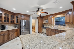 If you want a Texas-sized vacation, stay here! Check-in was easyâwe arrived a bit early, but the large front porch with rocking chairs was perfect for relaxing until 4. The smart lock made entry a breeze, and the house instantly gave off âgood vibes only.â The foyer welcomed us with high ceilings, a cozy living room to the left, and a game room to the right. The kids loved the air hockey and pinball! The spacious kitchen had everything needed to cook full meals. Downstairs had two bedrooms: one with two queen beds, and another with a twin, plus a full bath. Upstairs had four more bedrooms: one king room with its own full bath, two rooms (king and queen/twin) sharing a Jack-and-Jill bath, and a bunk room with two full bunks and a master bath with whirlpool tub and shower. Every bathroom was stocked with shampoo, conditioner, and body wash. The bunk room also had a TVâperfect kid hangout. Another upstairs game room had foosball and a Terminator game (loud but fun!). The highlight was the clean, crisp pool where the kids spent hours when it wasnât raining. We also enjoyed the grill and fire pit for sâmores. The owners were incredibly responsive and thoughtful. This home had everythingâweâre so grateful for the experience!