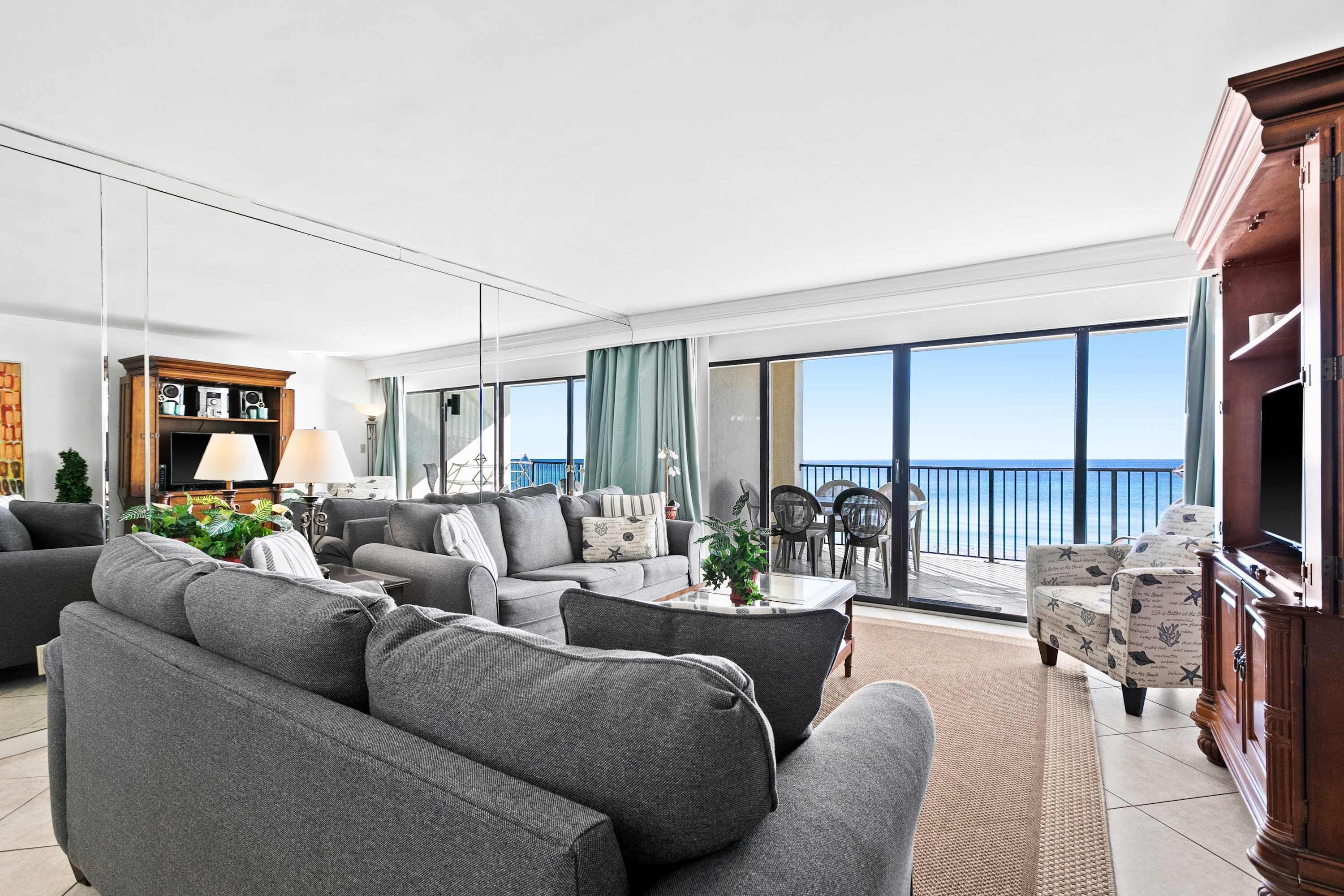 The master bedroom has incredible beach views and private access to the beachfront balcony. Complete with a king bed, flat-screen TV, walk-in closet, and private ensuite bathroom, the master bedroom was designed with relaxation in mind. The master bathroom features a jetted tub, walk-in shower, and two separate vanities. Both guest bedrooms face the north side of the resort and offer unbeatable views of the resort grounds. The first guest bedroom has a king bed, a flat-screen TV, and private access to the north balcony. This guest bedroom has a private bathroom with a walk-in shower. The second guest bedroom has two queen beds, a flat-screen TV, and private access to the north balcony. Just steps from both the second guest bedroom and the living area is a full bathroom with a tub/shower combination.