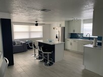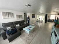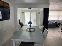 Open floor plan home with one car garage and carport on a quiet dead end street; washer/dryer; kitchen table seats 6 and island has four barstools; All coffee maker types; toaster; air fryer; pressure pot; fully furnished but no dishwasher; 2 BDR and 1 Full Bath along left front and 1 BDR along backâ-all with remote controlled ceiling fan/lights; canal front property with dock; floating dock with ladder; boat lift; fish sink; jacuzzi/hottub; outdoor bar seating, fridge/freezer; two ceiling fans on patio; covered glider swing. Large tv in living room. We enjoyed coffee on the floating dock each morning, watching the fish jump and the birds and duck families; in the evenings we sat on the dock again and also enjoyed the jacuzzi. Home was spotless and owner responds quickly to all inquiries.