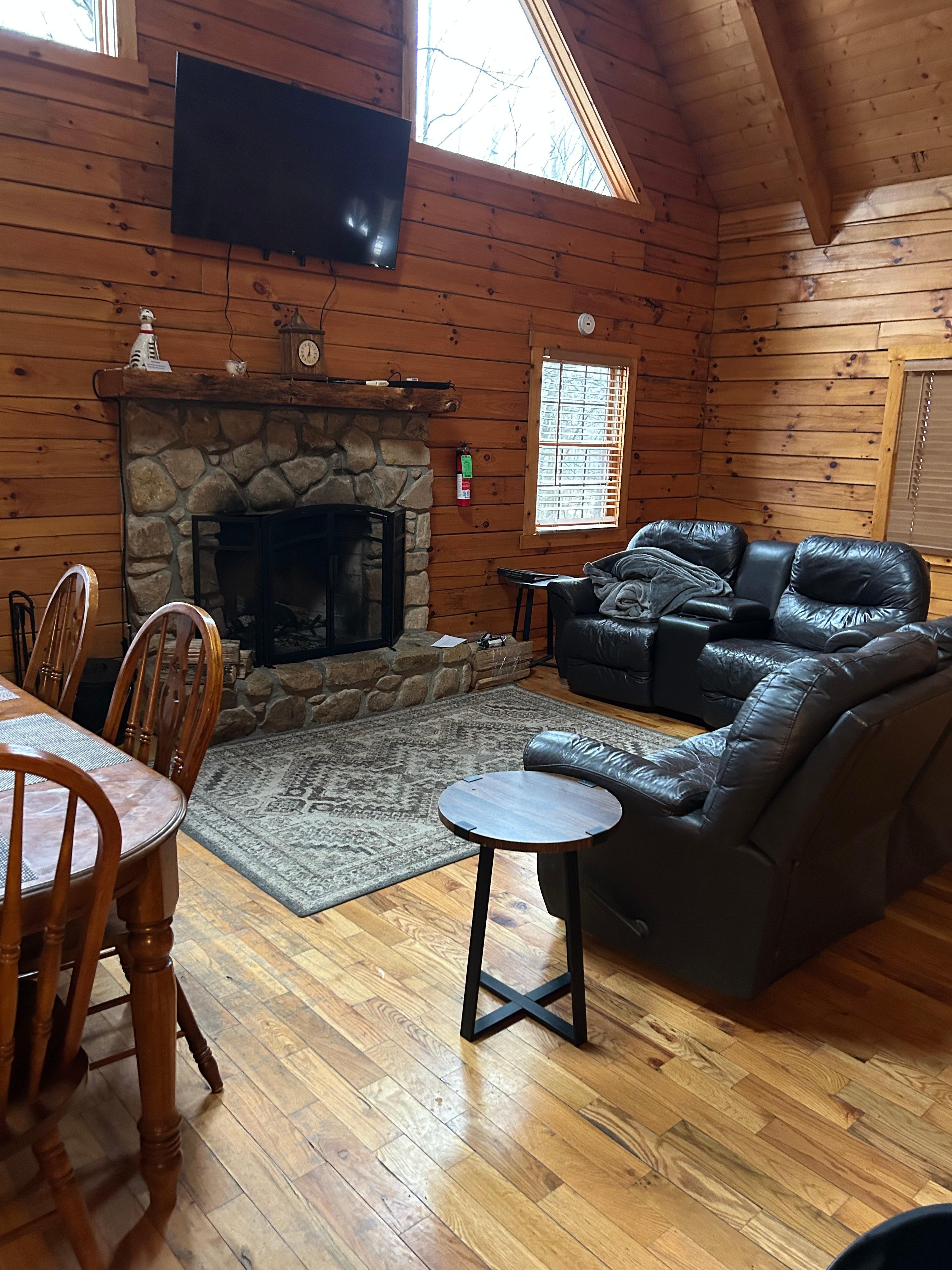 Great room with floor-to ceiling stone wood burning fireplace, couch and chair seating, TV with Roku and streaming capabilities with DVD player, access to front covered deck and rear covered hot tub deck, open to dining space and kitchen area