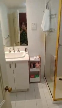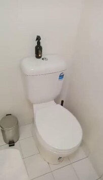 Une salle de bain avec douche, évier, serviettes, avec les petits savons et shampoings offerts. Les toilettes avec le petit sent-bon citronnée fourni.