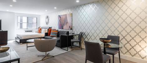 This spacious, thoughtfully designed one bedroom is located in a charming 14-story elevator building at the crossroads of Union Square, Astor Place, Greenwich Village and Gramercy.The apartment features hardwood floors, top-of-the-line stainless steel appliances, central air conditioning and ample closet space. All beds provided are fitted with plush linens and pillows. All Furnished Quarters apartments include 24/7 guest service.