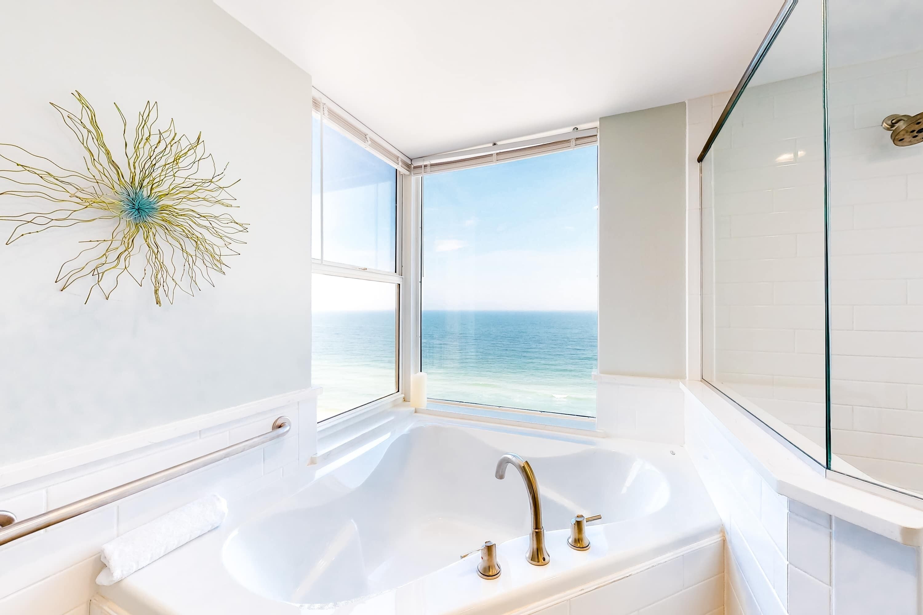 W404: Escape to this beautifully updated 4th-floor oasis on the west side of Eden. This unit blends modern comfort with breathtaking views up and down the Gulf Coast. Enjoy movie nights on the 65-inch Smart TV, mix drinks at the wine cooler, or cook delicious meals in the renovated kitchen featuring granite counters and stainless appliances. The master suite features a king bed and a, private bath with a tiled walk-in shower and a deep Jacuzzi tub. The guest room offers a queen and a twin, ensuring everyone has space. Includes full-size washer/dryer and free Wi-Fi.