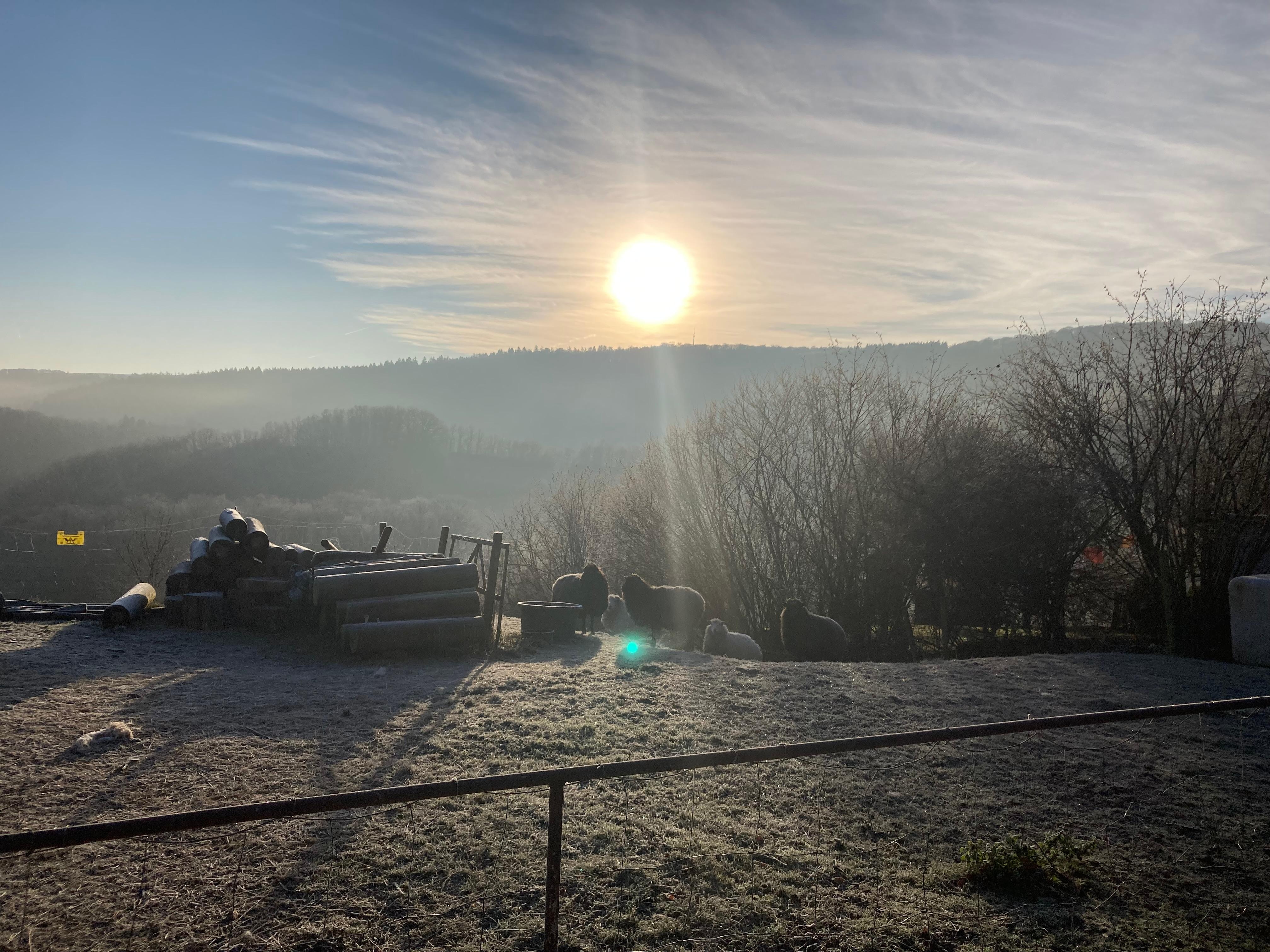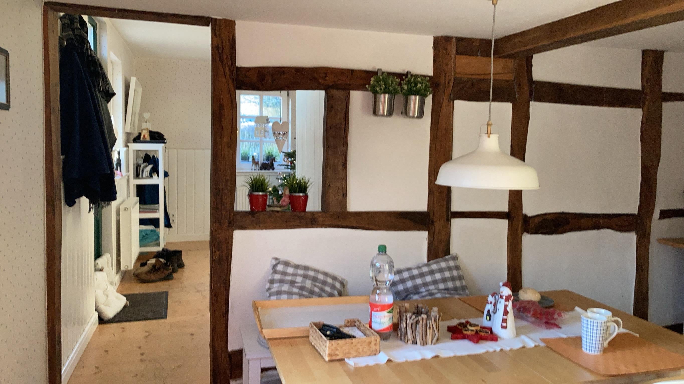 Gerne würden wir dem Aufenthalt die volle Punktzahl geben, weil wir uns sehr wohl gefühlt haben. Das erste Betreten war sehr einladend und auch an den Hund wurde gedacht. Die Leckerlis waren übrigens sehr lecker...Das Haus und Gelände waren wie auf den Bildern dargestellt. Die Schafe haben sich auch regelmäßig gezeigt und einige waren sogar mutig und haben sich streicheln lassen.Morgens mit einem Kaffee den Blick ins Tal schweifen lassen und zu beobachten, wie die Sonne die Feuchtigkeit aus den Wäldern vertreibt, ist für uns Nordlichter ein tolles Schauspiel. Vom Haus aus waren es nur wenige Schritte in die Natur zu Wander- oder Radausflügen. Im Haus waren viele Ausflugstipps für die Region vorhanden. Wir hätten natürlich ahnen können, dass in einem restaurierten Fachwerkhaus die Türen vielleicht niedriger sind, aber bei Körpergröße ab 1,80 tat es wohl mal weh.Und ja, auf den Bildern kann man die Küche gut erkennen, bei einem längeren Aufenthalt ist dann die Auswahl der Gerichte mit 2 Platten leider eher einschränkend.Das Gelände um das Haus ist großzügig und die Rosen blühten sehr schön, nur eben die Begleitvegetation auch...