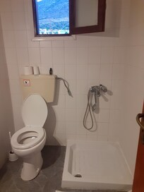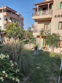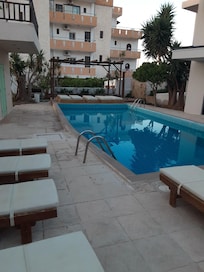 The location was very convenient, a supermarket within walking distance, the beach was 5 minutes by foot and excursion booth by the supermarket. The owner does charge $10 Euros for air conditioning per day which was not clearly described when booked. The pool and outdoor area was super! There is no microwave or coffee maker in the apartment, in the bathroom there was just a small showering pan with a handheld sprayer (no curtain) and there was not always hot water. We really enjoyed our stay and this was a great value for the money if you don't mind going without some modern conveniences.