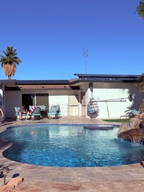 Let your dream vacation start ...and please give us a 5 star rating, if you enjoyed your stay. The house has 3 bedrooms and 2 full baths, office space, kitchen, washer/dryer room, and a stunning backyard with private pool, hot tub, outdoor bar, and a serenity area.