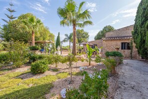 The exterior areas of the house are fantastic. There is a 5.5x3m salt swimming pool, with depth ranging from 1.15m to 1.70m. Around the pool, there is a shower and a paved area where you can relax sunbathing on one of the 6 sunbeds available to you. Around the house there is a gravel surface where you can relax. Just to the right of the homeâs main entrance there is a furnished terrace where you can enjoy wonderful outdoor barbecues with family and friends. The property is in a secluded location, surrounded by 14,000 square metres of land. 7,000 of them landscaped where you will find many Mediterranean plants such as fragrant rosemary, olive trees, cypress, palm trees, pine trees with shade and could not miss its orchard of lemon and orange trees. From the property, you can admire the surrounding Mallorcan countryside with stunning views of the Tramuntana mountains, Puig de Cura, Mont Ferrutx and Puig de Sant Salvador on the horizon. Stunning sunrises and beautiful sunsets are guaranteed.