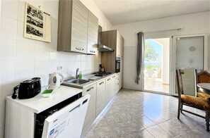 Zwei der Schlafzimmer sind Doppelzimmer (eines davon mit Meerblick), das dritte ist mit zwei Einzelbetten und das vierte mit einem Etagenbett ausgestattet. Es gibt zwei Badezimmer mit Dusche. Das Herzstück des Hauses ist das große Wohnzimmer mit offener Küche, Kamin, TV und Doppelschlafcouch; das Wohnzimmer öffnet sich zur schattigen Außenveranda, ideal für Ihre Mahlzeiten im Freien. Die Küche ist gut ausgestattet mit Geschirrspüler, Backofen, Gasherd, Kühlschrank, Geschirr, Besteck, Töpfen und allem, was Sie zum Zubereiten Ihrer Mahlzeiten benötigen. Es gibt Klimaanlage und Deckenventilatoren, eine Waschmaschine und kostenloses WLAN mit unbegrenztem Datenvolumen.