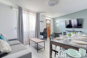En rez-de-chaussĂ©e dâune petite maison, il comprend 2 chambres, un salon convivial, une cuisine Ă©quipĂ©e et une salle dâeau moderne.