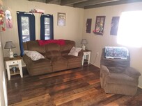 The entire stay was the most peaceful weekend I've ever had. The decorations the owners put up were absolutely adorable and perfect for fall. It helped us feel right at home. The beds were both very comfortable and it was easy to log into the wifi. The AC worked amazingly and the hot tub was absolutely delightful. String lights hung along the back provided enough light to see but not enough to take away from the stars out at night. We would absolutely stay again and hope to do so in the future. They had two chairs out front, two more on the back porch and a picnic table down by the fire pit providing plenty of seating options.