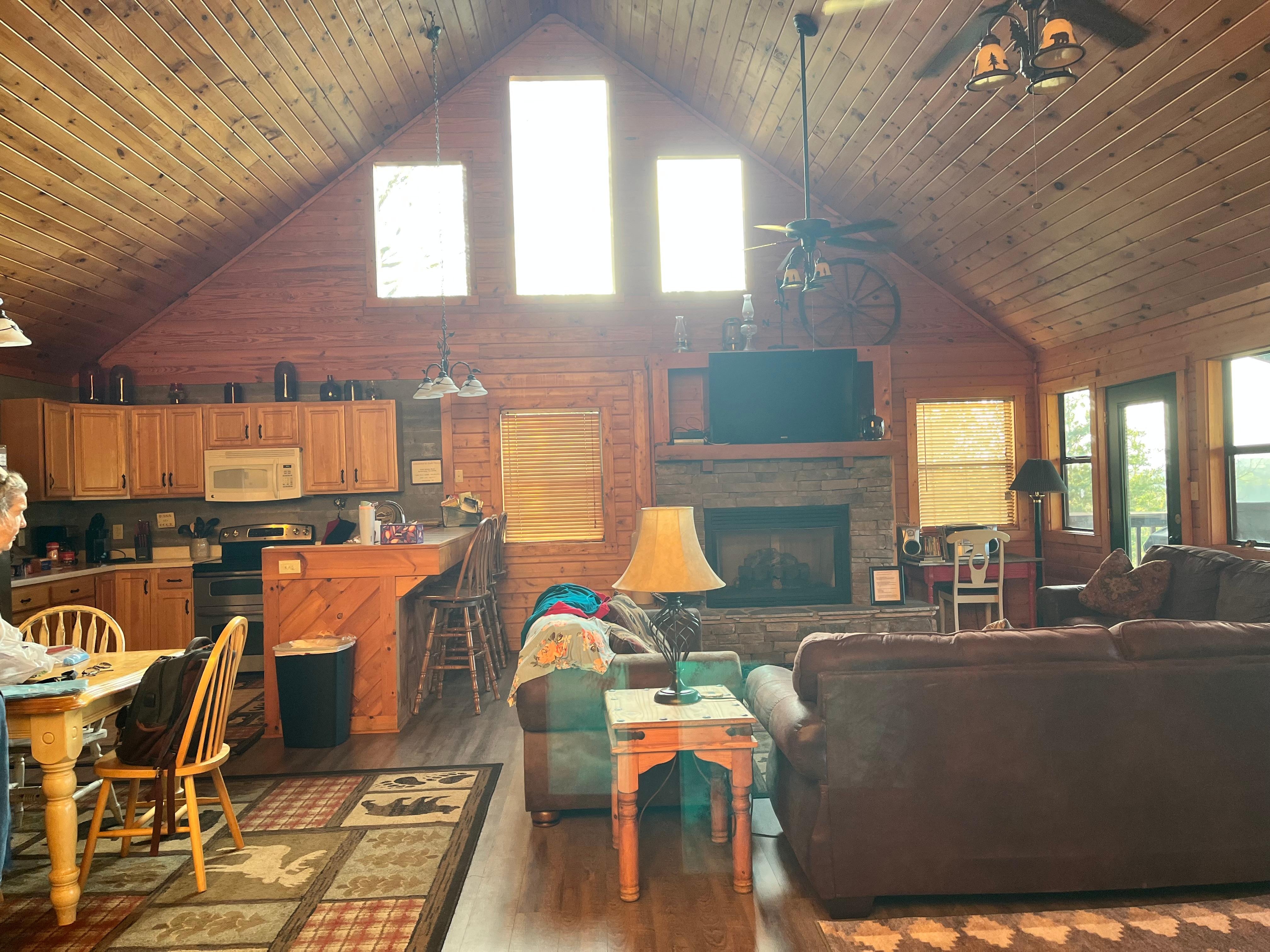 The cabin had great views and was in a good location. The 5 bathrooms were more than awesome to have... and I loved that all 3 bedrooms had king beds. The kitchen was well stocked with necessary items and the grill seemed almost brand new! The hot tub and deck are showing significant age - the hot tub sits on an angle (almost like the whole deck is starting to slant) so if there was more than 2 people in it, water would just pour out the side. The dishwasher is also showing age as it's rusted and many of the separators are broken off from rust.While the house was clean on the surface, there was a lot of dust on light fixtures and on the floor under furniture... I know those areas don't need to be cleaned all the time, but it still needs to be kept up.Overall, a good stay in the area!
